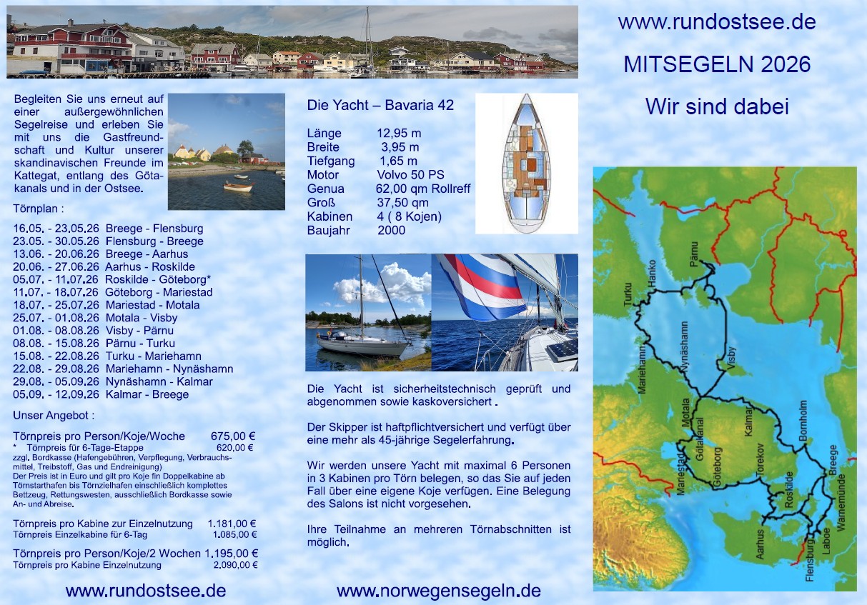 Auf unserer besonderen Segelreise möchten wir Ihnen erneut die Möglichkeit erschließen, auf eigenem Kiel die gesamte Skandinavienrunde mit zu segeln oder einige Etappen unseres Törns unter Begleitung eines erfahrenen Skippers zu absolvieren.